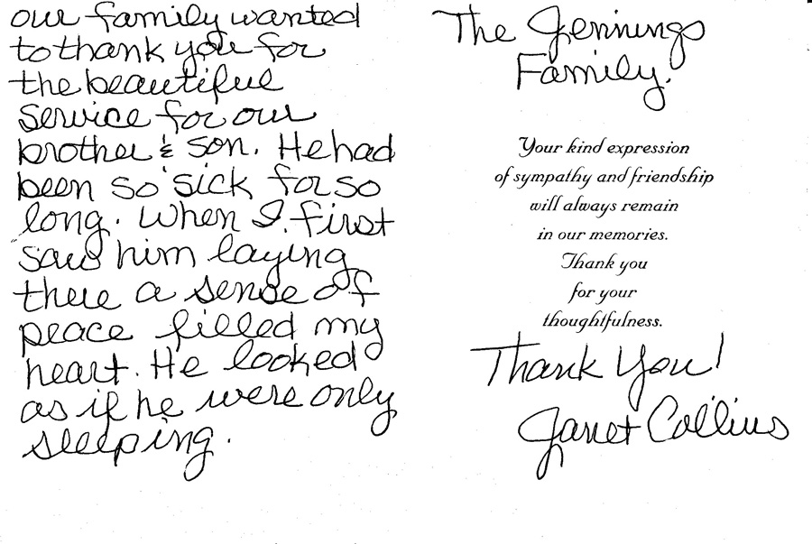 The family of Jackie Cross would like to thank you all for your kindness, you treated us like family. The first look at my brother and I was in peace that he looked in peace after months of suffering. It’s good to know we in a small town have people like Campbell-New to help people through tough times in their lives. Thank you and your staff from the bottom of our Hearts.